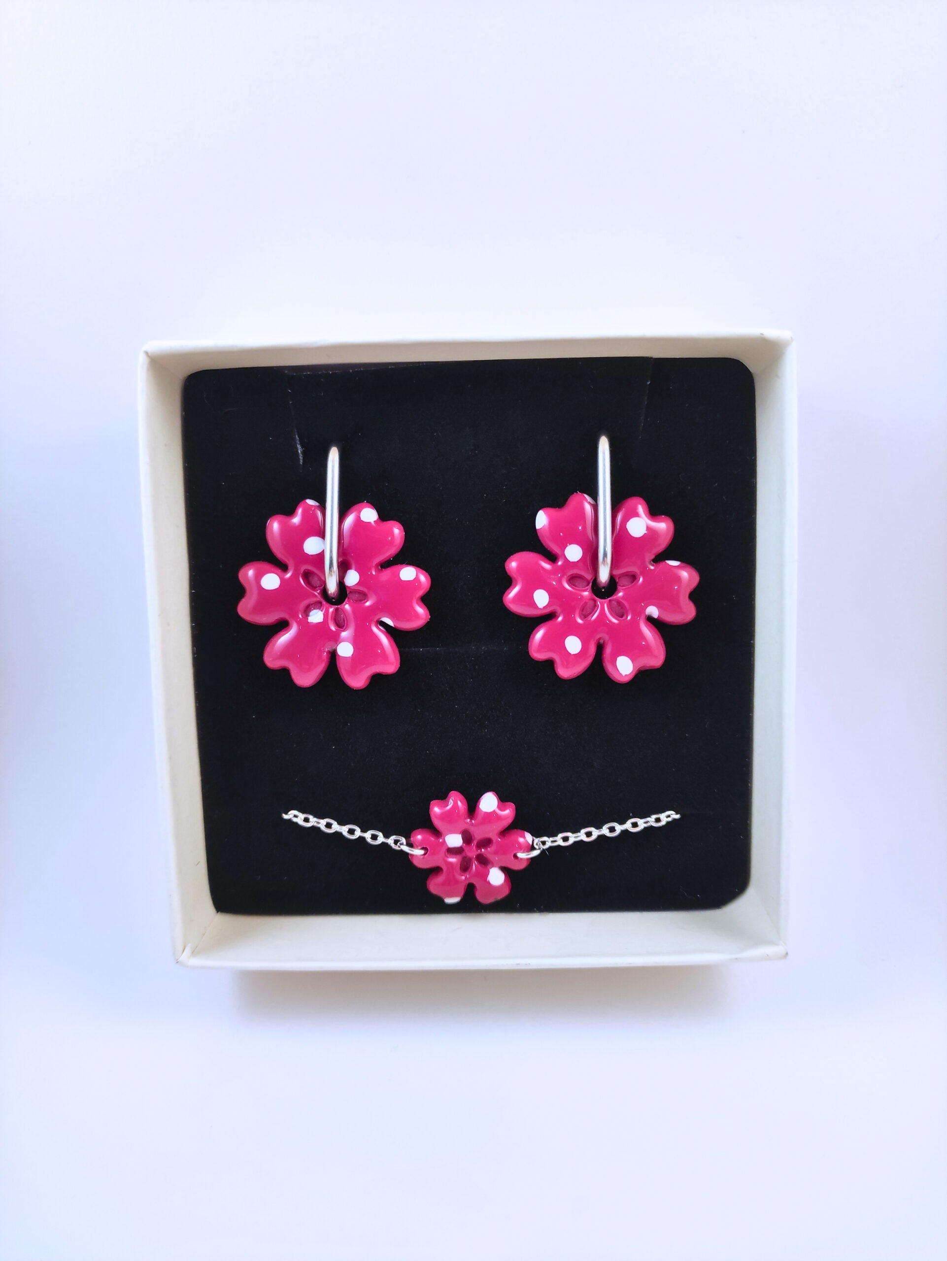 Chaque pièce est fabriquée à la main en argile polymère, puis recouverte d’une fine couche de résine pour une finition brillante et durable.
