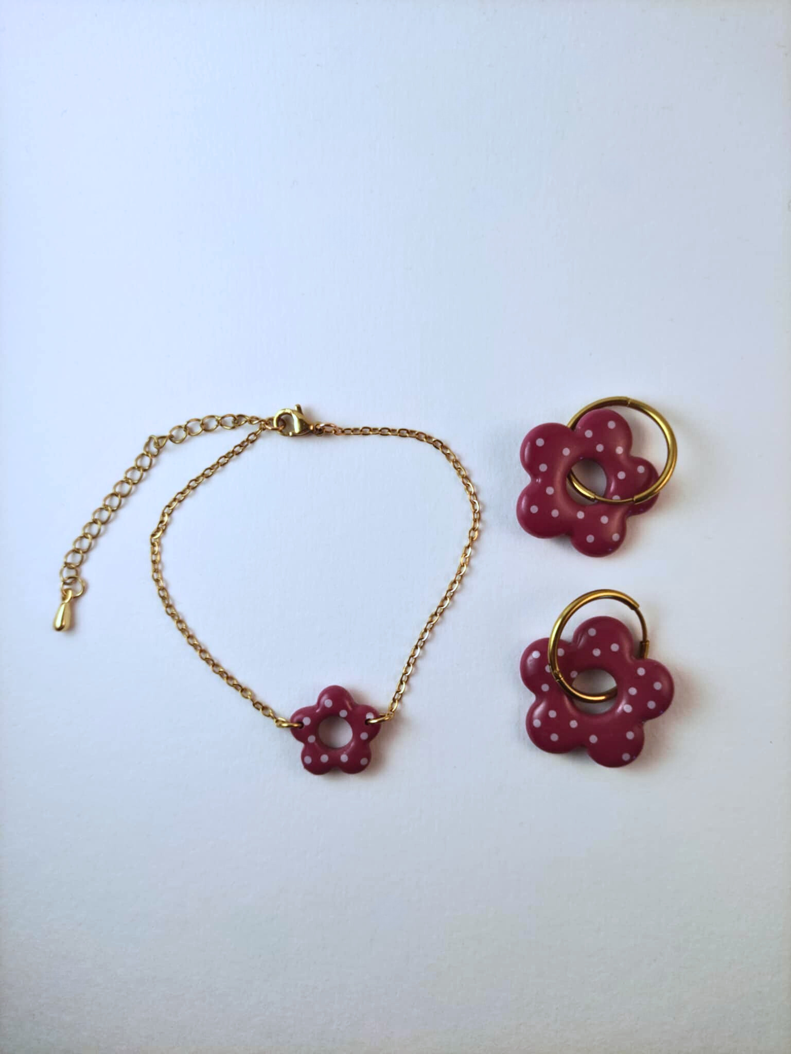 Apportez une touche d’élégance artisanale à vos tenues avec ce duo raffiné, composé d’un bracelet et de sa paire de pampilles a pois accompagnée d’une paire de créoles coordonnées. Chaque pièce est fabriquée à la main en argile polymère, puis recouverte d’une fine couche de résine pour une finition brillante et durable.