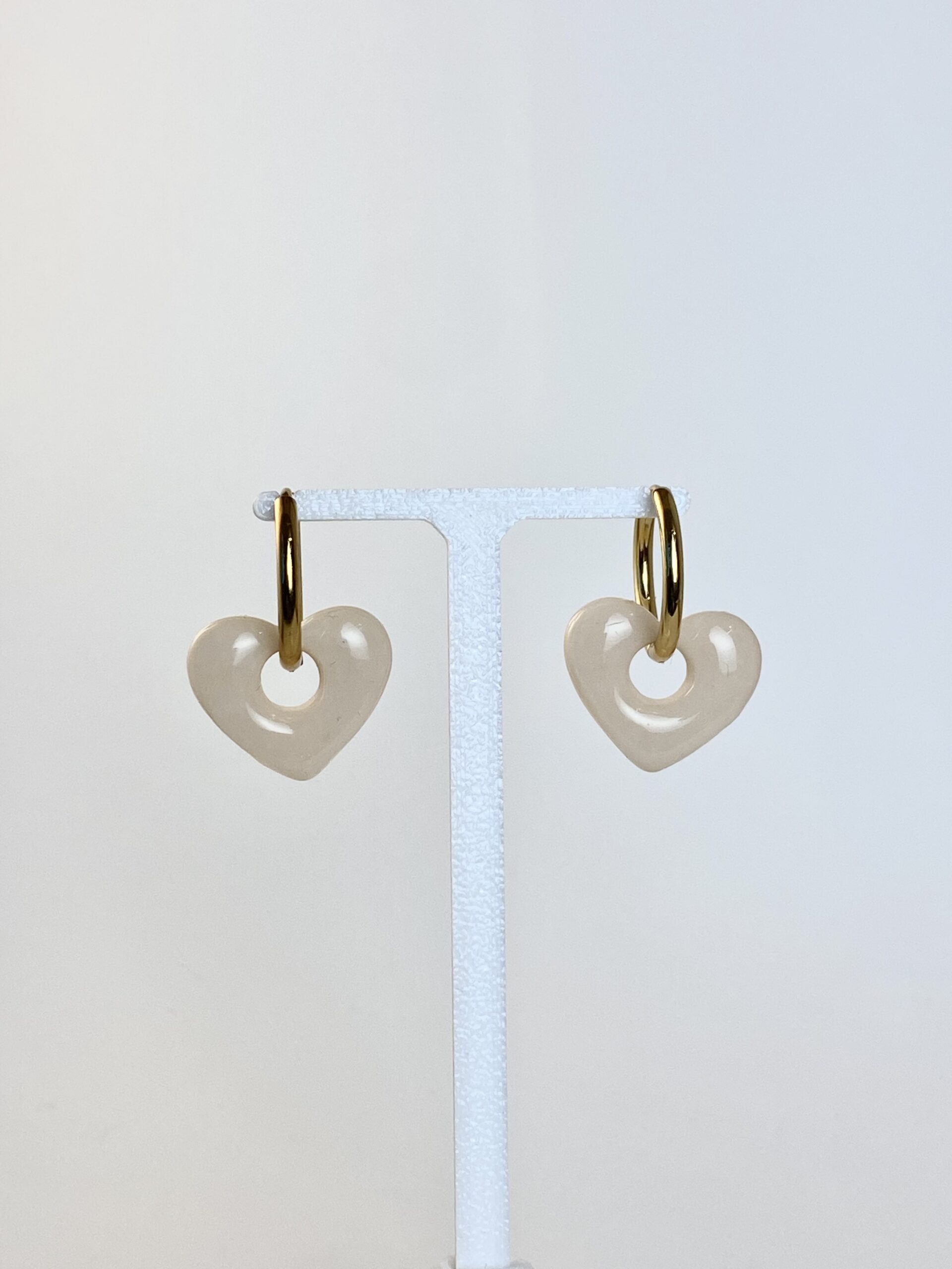 Pampilles petit cœur beiges sur créoles dorés en acier inoxydable d’un diamètre de 1.5cm